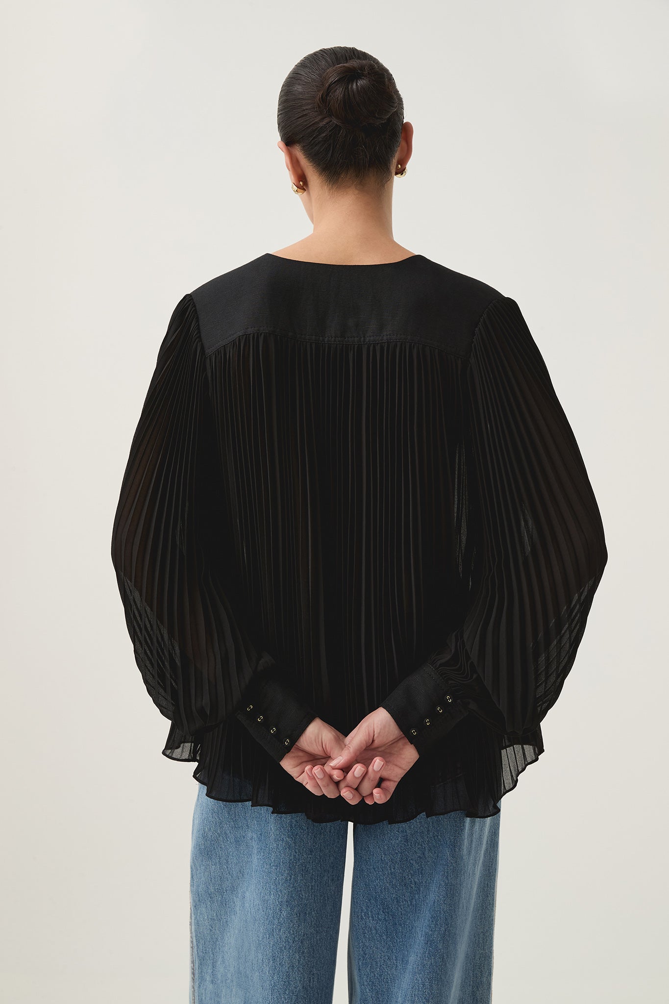 - Blouson sleeves with contrast cuffs