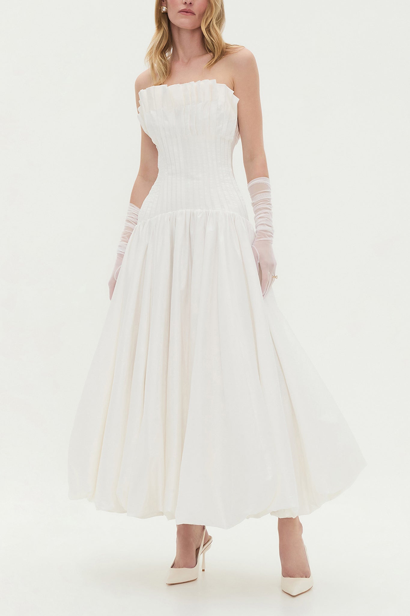 - Draped full skirt with bubble hem