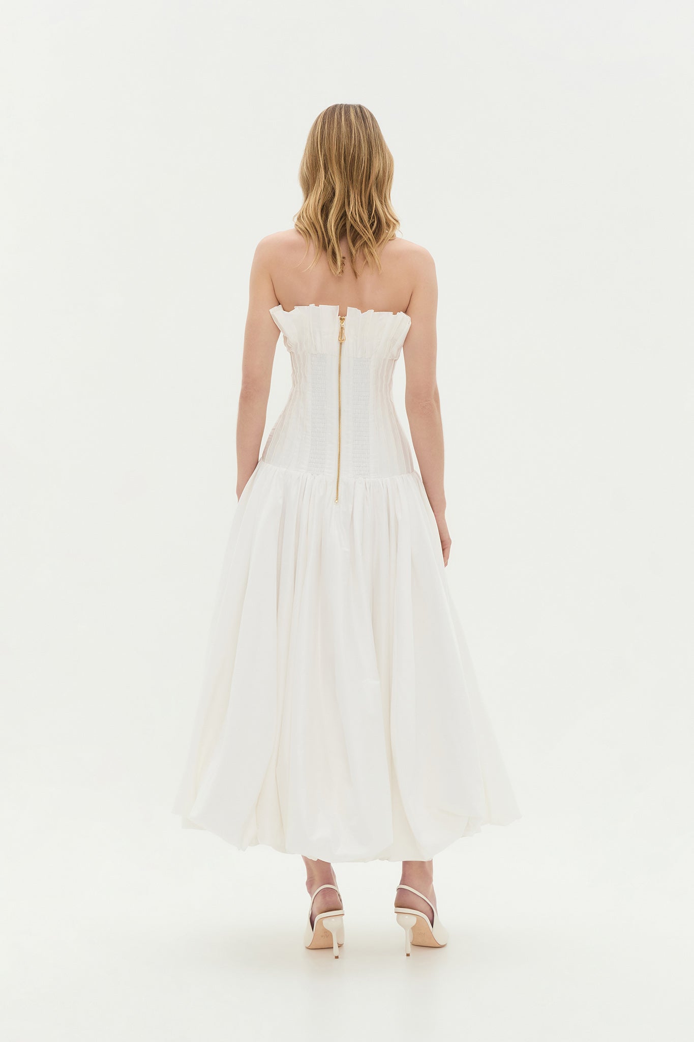 - External back zip with sculptural puller