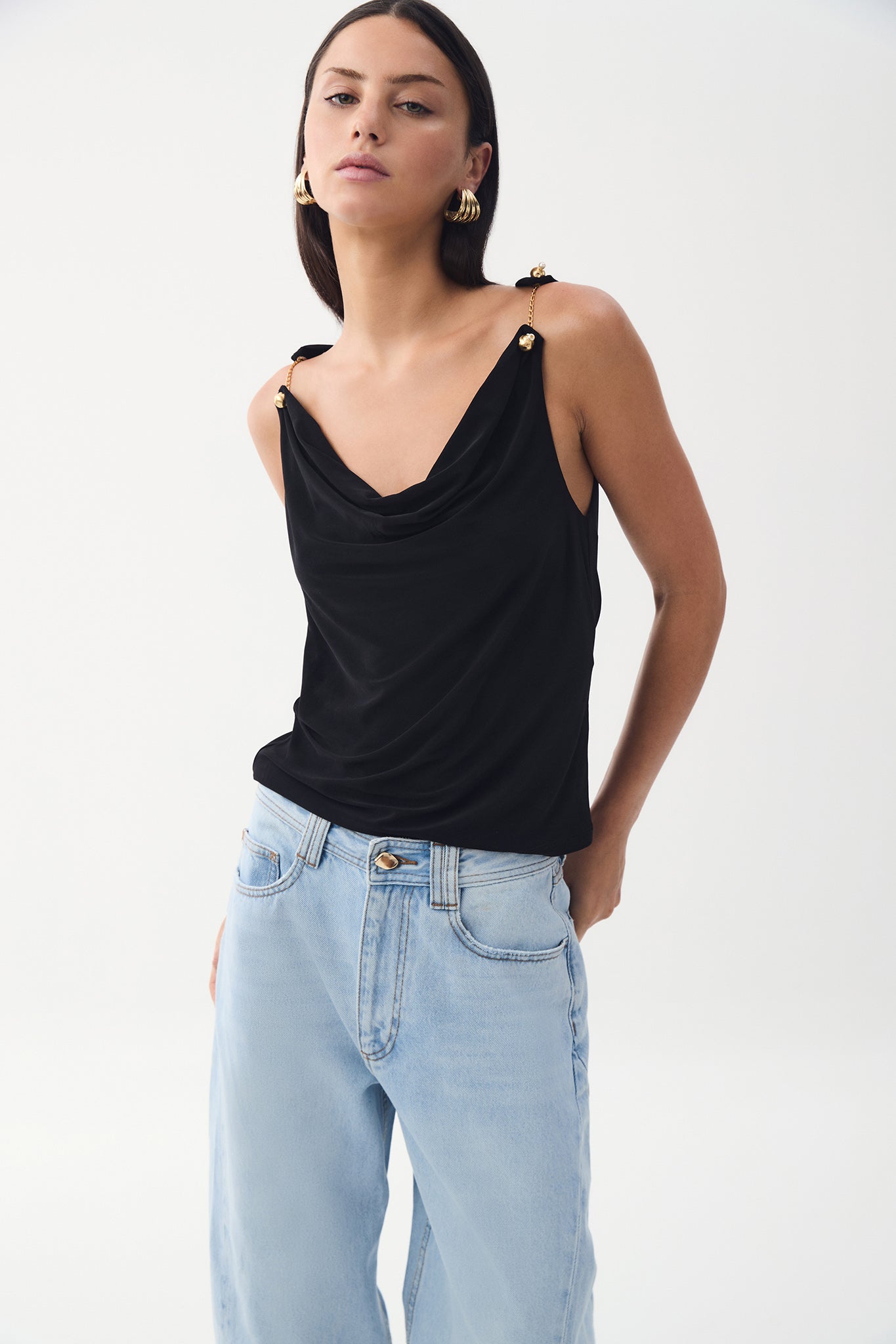 - Soft cowl neckline
