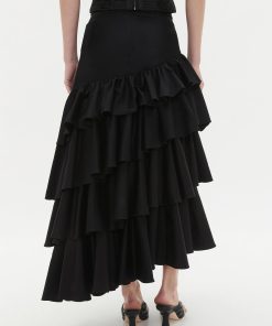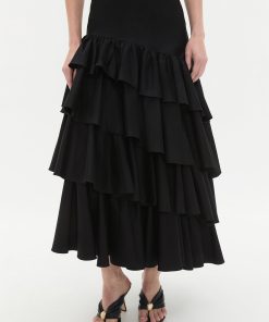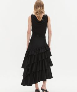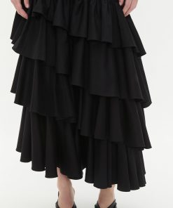 - Voluminous silhouette with gathered asymmetric tiers