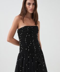 - Ruched pearl bead tulle overlay throughout bodice